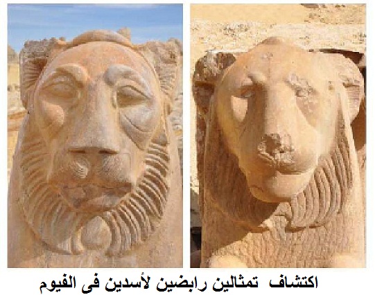 أعلن د. محمد إبراهيم وزير الدولة لشئون الآثار عن اكتشاف تمثالين من الحجر الرملي على هيئة أسدين رابضين يعودان للعصر البطلمى ، كشف عنهما في الجهة الغربية خارج معبد الإله سوكنوبايوس بمنطقة ديمه السباع بالفيوم محاطان برديم أحد أجزاء المعبد .