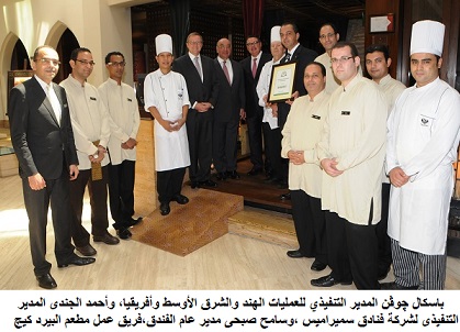 قام باسكال ﭽوﭭن, المدير التنفيذي للعمليات، الهند، الشرق الأوسط وأفريقيا IHG بزيارة فندق سميراميس إنتركونتيننتال حيث التقى بسامح صبحى, مدير عام سميراميس انتركونتيننتال و بمديرى الإدارات و فريق عمل مطعم البيرد كيچ التايلاندى و هنأهم لحصولهم لثالث سنة على التوالى بشهادتى الإمتياز من موقع tripadvisor لعام 2013 للفندق و لمطعم البيردكيچ و يعد الموقع من اكبر المواقع المهتمة بالسفر و السياحة و الاكثر ثقتاً من بين المواقع جميعاً |