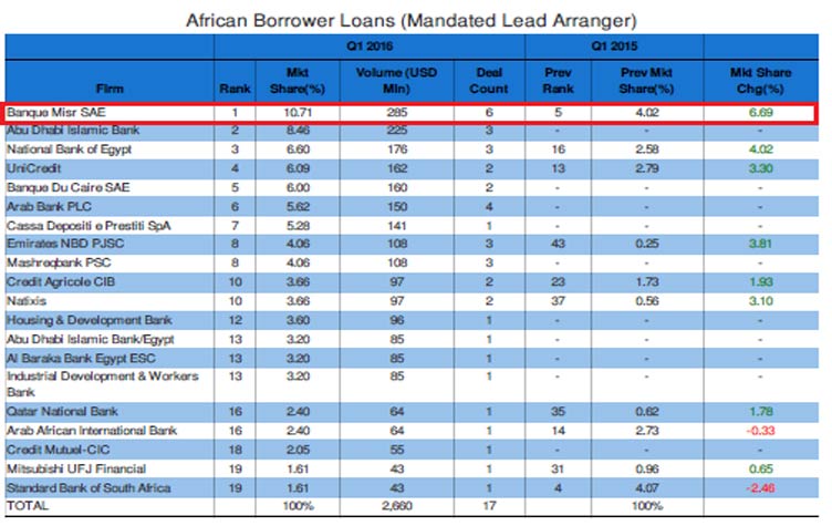 حصل بنك مصر علي المركز الأول كأفضل بنك في إدارة وترتيب القروض المشتركة وتمويل المشروعات على مستوى القارة الأفريقية وفقا لتصنيف وكالة بلومبرج العالمية / الربع الأول 2016"
