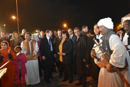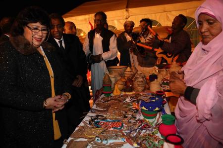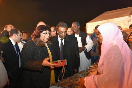 وفى نهاية الجولة حرصت وزير الثقافة على زيارة الخيمة المخصصة لحلايب وشلاتين التى تقيمها لأول مرة ضمن الفعاليات الهيئة العامة لقصور الثقافة برئاسة الدكتور احمد عواض وشاهدت عرضاً لفرقتي الفنون التلقائية من حلايب والفنون الشعبية من شلاتين اللذان ظهرا بالزى التقليدى كما حرصت على اقناء مجموعة من المشغولات اليدوية التى تحمل الطابع التراثى والبيئى المميز للجنوب المصرى من المعرض المصاحب كما لبت دعوة اعضاء الفرقة والقائمين على المعرض وتذوقت القهوة على طريقتهم الخاصة مؤكدين ان مشاركتهم فى معرض الكتاب تدعم فكرة المواطنة مطالبين بتمثيل مصر فى الاحداث الفنية الدولية .