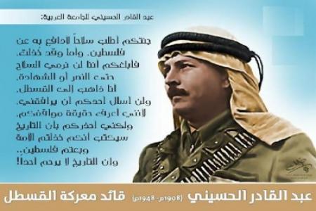 عبد القادر موسى كاظم الحسيني قائد عسكرى فلسطيني خاض العديد من المعارك ضد العصابات الصهيونية قبل عام 1948م وكانت أمه هي رقية بنت مصطفي هلال الحسيني والتي توفيت بعد عام ونصف العام من ولادته أما والده فقد كان شيخ المجاهدين موسى باشا كاظم الحسيني أحد أفراد عائلة الحسيني الشهيرة والذى كان قد درس في إسطنبول عاصمة الخلافة العثمانية ثم إلتحق بعد تخرجه بخدمة الإدارة العثمانية فعين قائمقاماً في يافا وصفد وعكار وإربد فمتصرفا في عسير باليمن ثم نقل إلى تبليس وأرجميدان في الأناضول ثم إلى حوران في سوريا فالمتفق في العراق وظل هناك إلى أن أحيل على التقاعد عام 1914م فعاد إلى القدس ونظرا لخدماته للإدارة العثمانية فقد تم منحه رتبة البشوية وبعد عودته بسنوات قليلة إختارته سلطات الإحتلال البريطاني حيث كانت بريطانيا قد إحتلت فلسطين عام 1917م ليكون رئيسا لبلدية القدس أي عمدة لها ما بين عام 1918م وعام 1920م وكانت سلطات الإحتلال البريطاني قد إشترطت عليه حين تم إختياره لهذا المنصب ألا يشتغل بالسياسة إلا أنه لم يتقيد بهذا الشرط فإستقال من منصبه في أوائل عام 1920م وقاد في شهر مارس من نفس العام مظاهرات ضخمة كانت تطالب بإنضمام فلسطين إلى سوريا وتهاجم الإستعمار الصهيوني وبعد ذلك أصبح رئيسا للجنة التنفيذية الوطنية للمؤتمر العربي الفلسطيني من عام 1922م وحتي وفاته في عام 1934م وكان يعد الأب الجليل للحركة الوطنية الفلسطينية طوال السنوات التي قضاها رئيسا للجنة التنفيذية العربية وترأس خلالها جميع الوفود التي ذهبت إلى لندن لإقناع حكومتها بالتخلي عن سياسة وعد بلفور وهو البيان العلني الذى أصدرته الحكومة البريطانية في شهر نوفمبر عام 1917م خلال الحرب العالمية الأولى علي لسان وزير خارجيتها آرثر بلفور بدعم تأسيس وطن قوميّ للشعب اليهوديّ في فلسطين التي كانت منطقة عثمانية ذات أقلية يهودية حيث كان اليهود يمثلون 5% علي الأكثر من سكانها حينذاك وقد طالب المؤتمر العربي الفلسطيني برئاسته بطلان وعد بلفور وإلغاءه ومنع الهجرة اليهودية إلي فلسطين وطالب ايضا بتأسيس حكومة وطنية مسؤولة أمام مجلس نيابي ينتخب أعضاءه أهل فلسطين كما نادى بتوحيد فلسطين مع شقيقاتها العربيات وعلى أثر ثورة يافا التي نشبت في عام 1921م وإمتدت إلى أنحاء فلسطين كلها عقد المؤتمر العربي الرابع في القدس يوم 25 يونيو عام 1921م وتقرر فيه إرسال وفد الى بريطانيا برئاسة موسى كاظم الحسيني لعرض القضية على الرأي العام البريطاني وكنتيجة لإتصالات وجهود الوفد رفض مجلس اللوردات في يوم 20 يونيو عام 1922م الموافقة على صك الإنتداب البريطاني على فلسطين وعلي وعد بلفور ولكن مجلس العموم إتخذ قرارا معاكسا في يوم 4 يوليو عام 1922م أيد فيه سياسة الحكومة البريطانية القائمة على إنشاء الوطن القومي اليهودي في فلسطين وفي عام 1933م قاد المظاهرات في يافا وأصيب أثناءها بجراح نقل على أثرها إلى المستشفى وتوفي في يوم 27 مارس من السنة التالية 1934م ودفن في المدرسة الخاتونية بباب الحديد غربي الحرم القدسي الشريف ودفن إلي جواره فيما بعد إبنه عبد القادر الحسيني بطل معركة القسطل التي سنتكلم عنها في السطور القادمة .