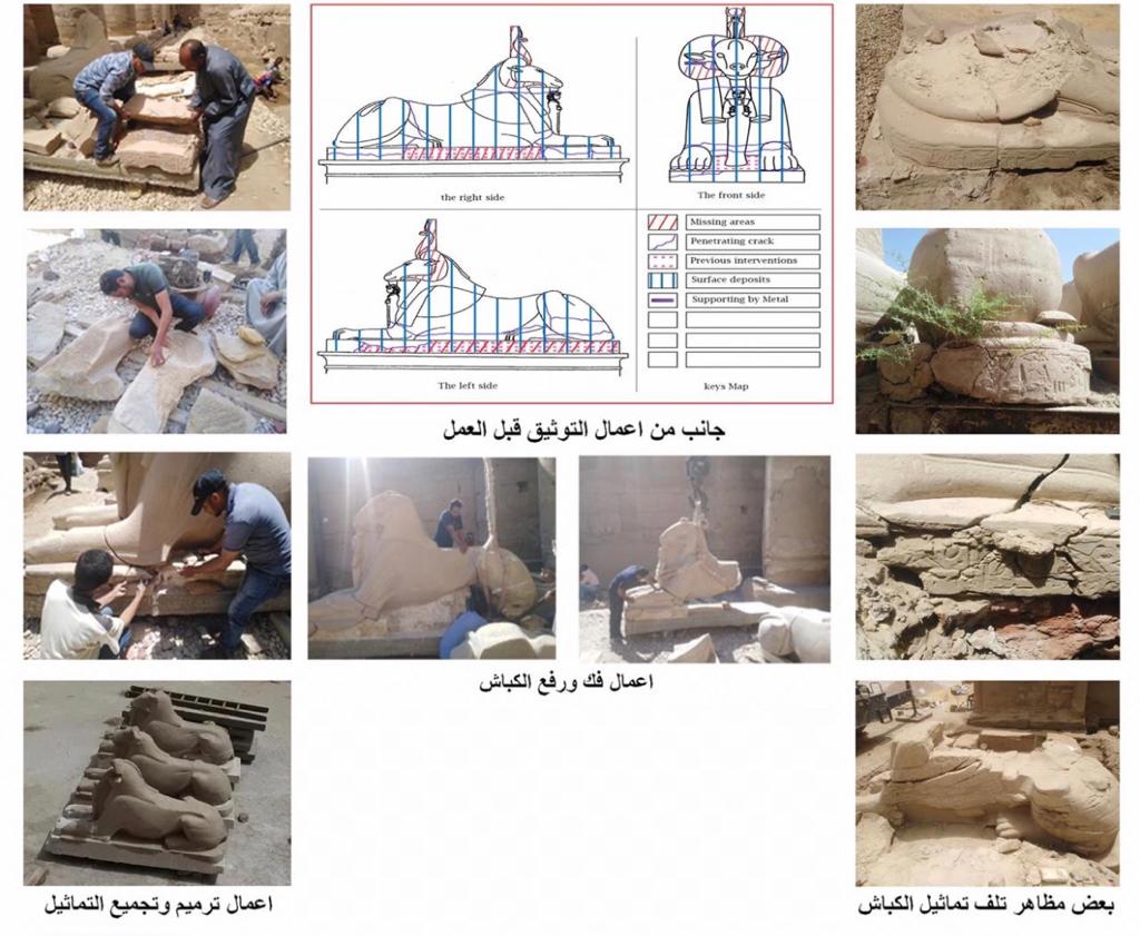 وأشار إلى أن أعمال الترميم شملت طرق التوثيق المختلفة من تصوير فوتوغرافي والرسم لاظهار مظاهر التلف الموجودة على الكباش، ثم بدء تحريك الكباش كل كبش على حدة على مخدات مستوية للبدء في إجراءات ترميمه بالكامل، حيث تبدأ اعمال الترميم والتنظيف الميكانيكي لإزالة الأتربة، يليها عمليات التقوية باستعمال المواد المخصصة لها والمتعارف عليها عالميا لتقوية الأجزاء الضعيفة؛ أما الأجزاء الكبيرة فيتم استعمال الاستانلس المقاوم للصدأ لتجميعها، مؤكدا أنه تم حتي الآن الانتهاء من ترميم ثلاثة كباش ولايزال العمل مستمرا.