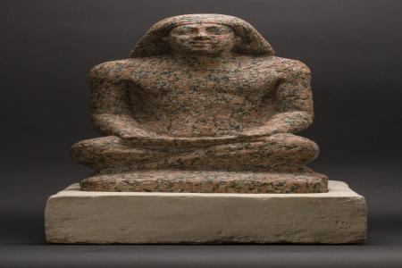 تمثال صغير مصنوع من الجرانيت للكاتب المصري يرتدى نقبة قصيرة وشعر مستعار وقلادة تحيط بالرقبة باسطاً كلتا يديه على ركبته جالس.