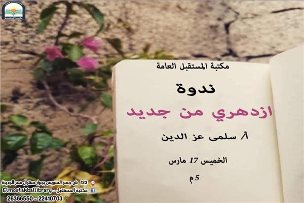 "ازدهري من جديد "عنوان الندوة التى تنظمها مكتبة المستقبل ، احدى المنصات الثقافية بجمعية مصر الجديدة بمناسبة شهر المرأة والذى يواكب عيد الام المصرى ويوم المرأة العالمى ، وذلك فى الخامسة من مساء غد الخميس 17 مارس .