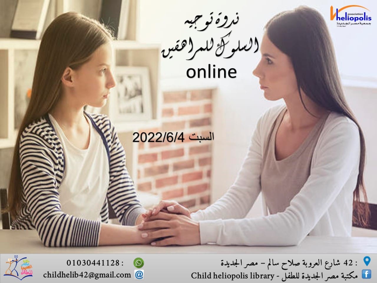 تنفذ الندوة مكتبة مصر الجديدة للطفل اونلاين الساعة 12 من ظهر غد السبت وتحاضر فيها الدكتورة ايمان ممتاز استشارى علاقات اسرية وارشاد نفسى . وسوف تتحدث عن خصائص المرحلة العمرية للمراهقين والمراهقات في الفترة التي تمتد من سن 13 إلى 17 تقريباً من الناحية العقلية والناحية النفسية والناحية الاجتماعية، ومن ثم عرض بعض من التحديات التي تواجه المراهق.
