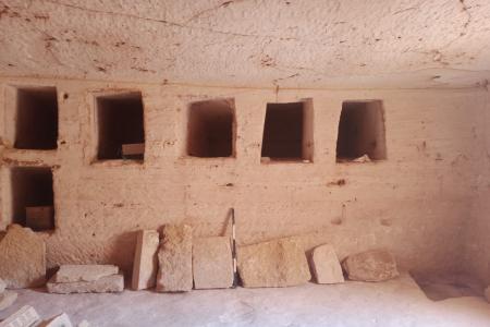ومن جانبه أوضح الدكتور أيمن عشماوي رئيس قطاع الآثار المصرية بالمجلس الأعلى للآثار، أن مقبرتي الكتاكومب، لهما درج ينتهي بردهة مستوية أمام مدخل حجرة الدفن يؤدي إلى حجرة الدفن الرئيسية مربعة الشكل ذات سقف مقبي بداخلها مواضع الدفن المنحوت في الصخر Loculi، والتي كانت مغلقة بإحكام بسدادات من الحجر الجيري. أما مكان دفنة صاحب المقبرة فكان مغلق بباب وهمى ترتكز جوانبه على عمودين دوريين نحتا بالنحت البارز وفى المنتصف تم تجسيد باب ذو ضلفتين يعلوه إفريز دوري يحتوي على زخرفة الأسنان وأسفله توجد مائدة قرابين من الحجر الجيري. |