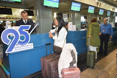 استكمالا لاحتفالات عيد الطيران المدني الـ95 وفي إطار عروضها المستمرة بهذه المناسبة، فاجأت الشركة الوطنية مصر للطيران عددا من عملائها المسافرين من مطار القاهرة على متن رحلاتها الدولية والداخليه صباح اليوم برد قيمة التذكرة للراكب رقم 95 في إنهاء إجراءات السفر علي متن عدد من الرحلات المختلفة في أجواء احتفالية مبهجة.