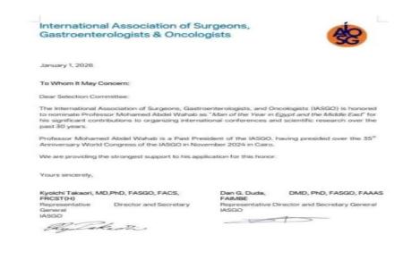 من جانبه، أعرب الدكتور محمد عبدالوهاب عن سعادته بهذا الاختيار، مؤكدًا أن التكريم صادر عن مؤسسة علمية عالمية رفيعة المستوى تضم نخبة من كبار علماء الجهاز الهضمي والكبد من مختلف دول العالم.