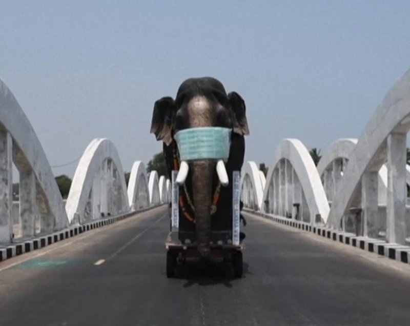 وسط هذه الأزمة وبعد انحسار السياحة وعدم وجود زوار أو سياح ومريدي ركوب الأفيال وجد البعض الوقت لصنع مجسم لفيل ضخم يسير على أربعة دواليب وألبسوه كمامة غطت عينيه وأنفه في منطقة تشيناي في تاميل نادو بالهند.