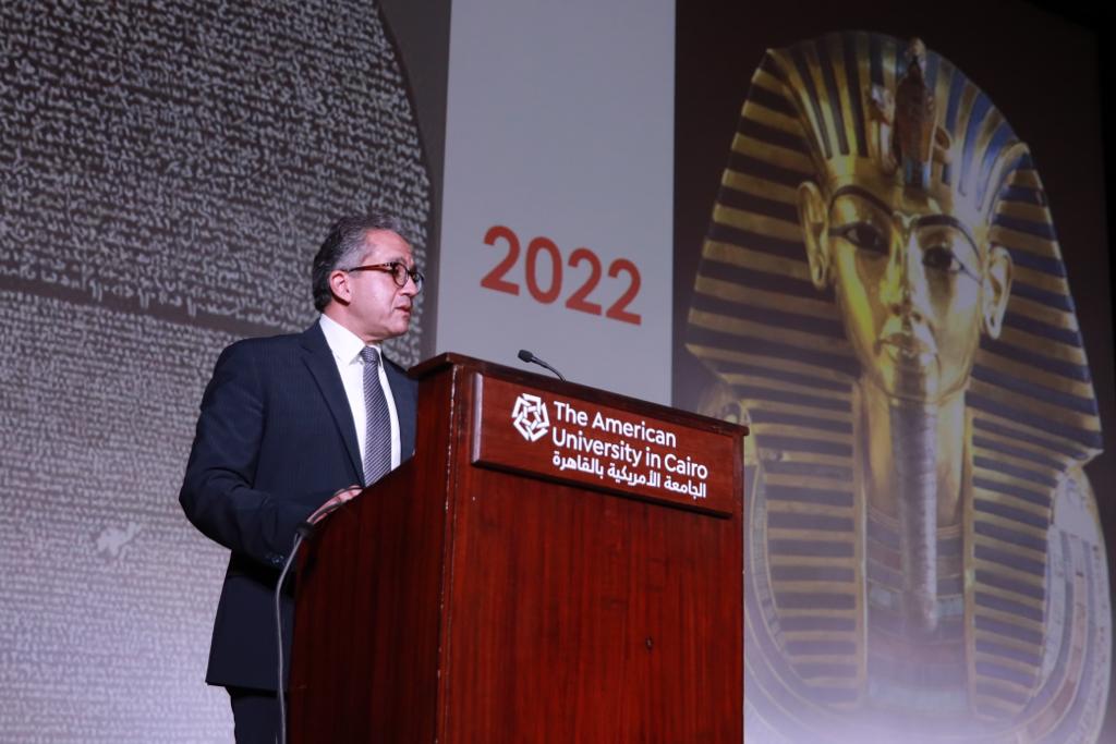 ألقى مساء يوم الثلاثاء الموافق 18 يناير الجارى الدكتور خالد العناني وزير السياحة والآثار محاضرة عن جهود وزارة السياحة والآثار في مجال الحفائر والاكتشافات ومشروعات ترميم الآثار وتطوير وبناء المتاحف، واسترداد الآثار المهربة، وذلك بقاعة إيوارت بمقر الجامعة الامريكية بالتحرير.