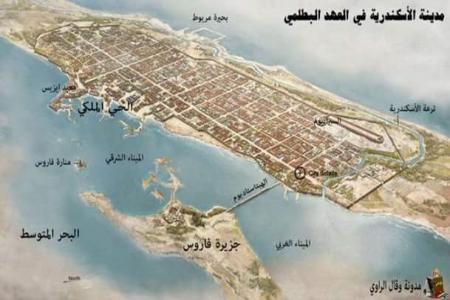 ويقال إن الإسكندر الأكبر قد دفن هناك بهذه المنطقة بعد عودة جثمانه من بابل وكان تخطيط المدينة المشار إليه هو ما شاع إستخدامه فى العديد من المدن اليونانية منذ القرن الخامس قبل الميلاد وهو يتميز بسهولة التنقل داخل المدينة مما يسهل عملية الدفاع عنها إذا ما تعرضت للحصار أو لهجوم عليها من الخارج وكان أمام المدينة جزيرة تسمي جزيرة فاروس تم ربطها باليابسة عن طريق ممر أو جسر سمي بالهيباستاديون وكان جسرا ضيقا نسبيا ثم تحول ليابسة ضمت الجزيرة بالبر ولتصبح شبه جزيرة وهي التي بنيت عليها منارة الإسكندرية في عهد بطليموس الثاني المعروف بإسم فيلادلفيوس ما بين عام 280 ق.م وعام 270 ق.م ثم بني مكانها بعد إنهيارها في القرن الرابع عشر الميلادى قلعة قايتباى في أواخر القرن الخامس عشر الميلادى وكان طول هذا الجسر 1300 متر ونتيجة لإنشاء هذا الجسر أصبح هناك ميناءان أحدهما شرقي يسمى بالميناء الكبير والأخر غربي ويسمى ميناء العود الحميد وتم تقسيم المدينة الى خمسة أحياء حملت حروف الأبجدية اليونانية الأولى ومن هذه الأحياء الحى الملكى أو البروكيون والحى الوطنى وحى اليهود وكان الشارع الرئيسي الذى يمتد من الشرق الى الغرب فى وسط المدينة هو شارع كانوب أما الشارع الرئيسي المتعامد معه والذى يمتد من الشمال إلى الجنوب هو شارع سوما كما ذكرنا في السطور السابقة كما كان من ضمن تخطيط المدينة معبد السرابيوم لعبادة الإله سيرابيس وكان يقع بالمنطقة بين باب سدرة وكوم الشقافة وكان بجواره معبد الإله مترا الإغريقي واللذان تهدما أيام الرومان وسرعان ما إكتسبت مدينة الإسكندرية شهرتها بعدما أصبحت سريعا مركزا ثقافيا وسياسيا وإقتصاديا وكانت تتسم في مطلعها في عهد الإسكندر بالصبغة العسكرية كمدينة للجند الإغريق ثم تحولت أيام خلفائه البطالمة الإغريق إلي مدينة ملكية بحدائقها وأعمدتها الرخامية البيضاء وشوارعها المتسعة .