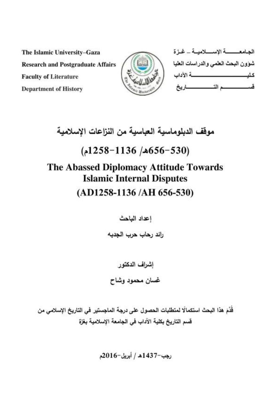 قُدم هذا البحث استكمالاً لمتطلبات الحصول على درجة الماجستير في التاريخ الإسلامي من